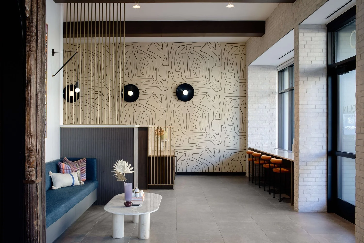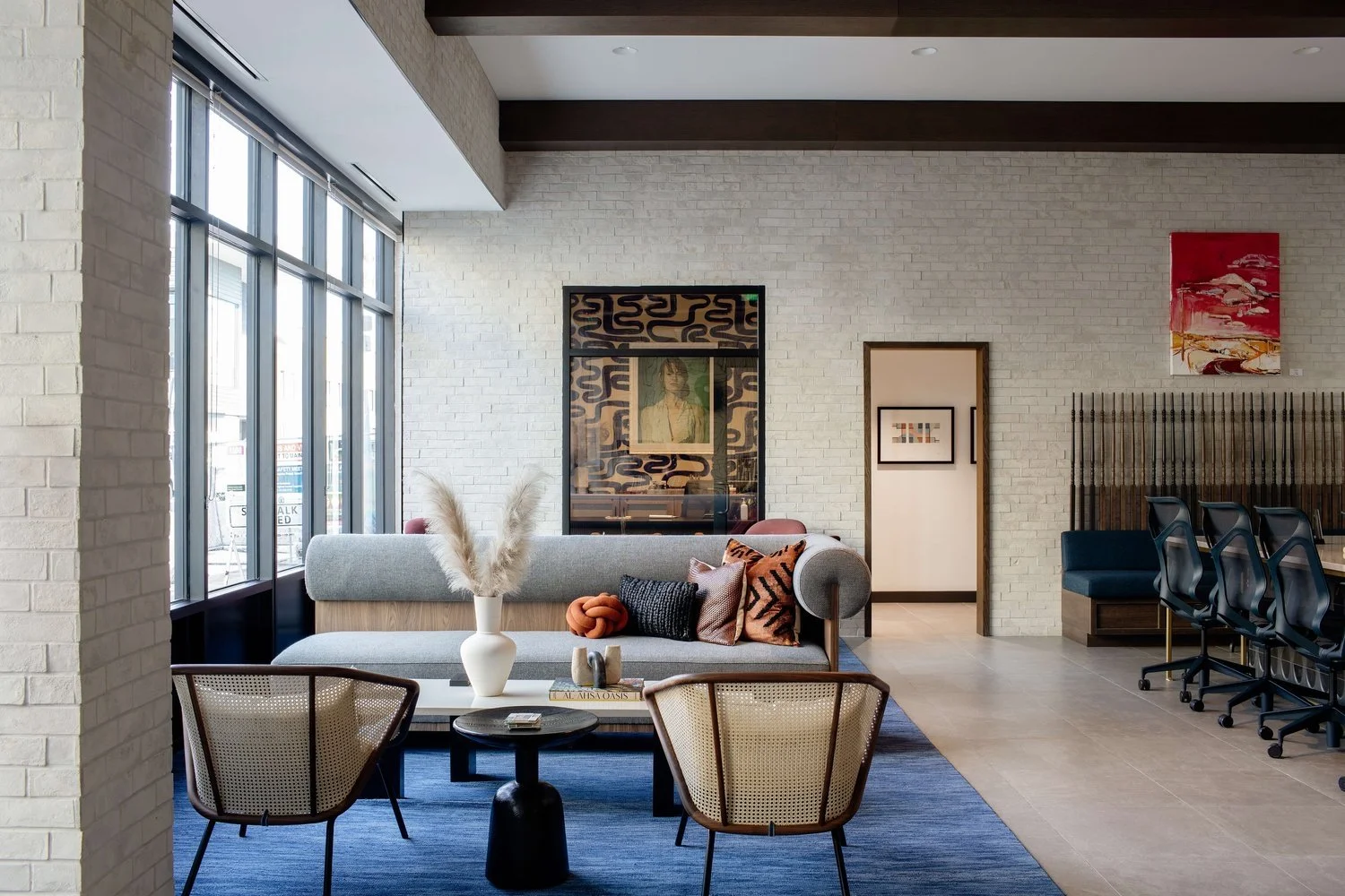 Woven Vibrance. The project is located in the Santa Fe arts district and we wanted to celebrate that. Studying the historic and current demographic of the neighborhood was very inspiring and a huge catalyst in pulling together a project that is very art forward. We took a cues from the diverse and eclectic vibe of the neighborhood, weaving that artistry through, keeping the background subdued and allowing art and furniture to standout.